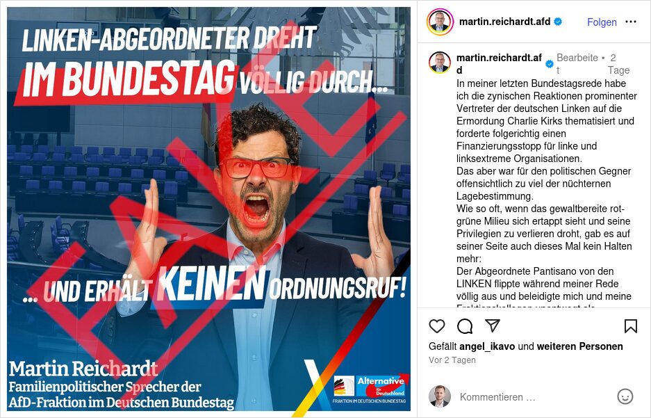 „Linken-Abgeordneter dreht im Bundestag völlig durch…“ – unter dieser Überschrift postete der AfD-Bundestagsabgeordnete Martin Reichardt auf Instagram ein Foto von Luigi Pantisano, dem verkehrspolitischen Sprecher der Fraktion Die Linke im Deutschen Bundestag. Das Bild zeigte Pantisano schreiend, mit aufgerissenen Augen und gehobenen Händen. Es handelte sich aber um eine Fälschung, die offenbar mittels KI erstellt worden war.